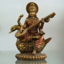 This image depicts Saraswati, the Hindu goddess of knowledge, music, arts, and wisdom. She is seated on a white swan, playing a veena, a stringed instrument. She is adorned with jewelry and draped in white and red.